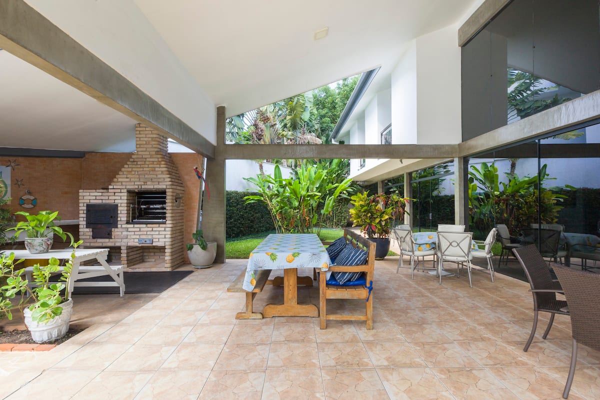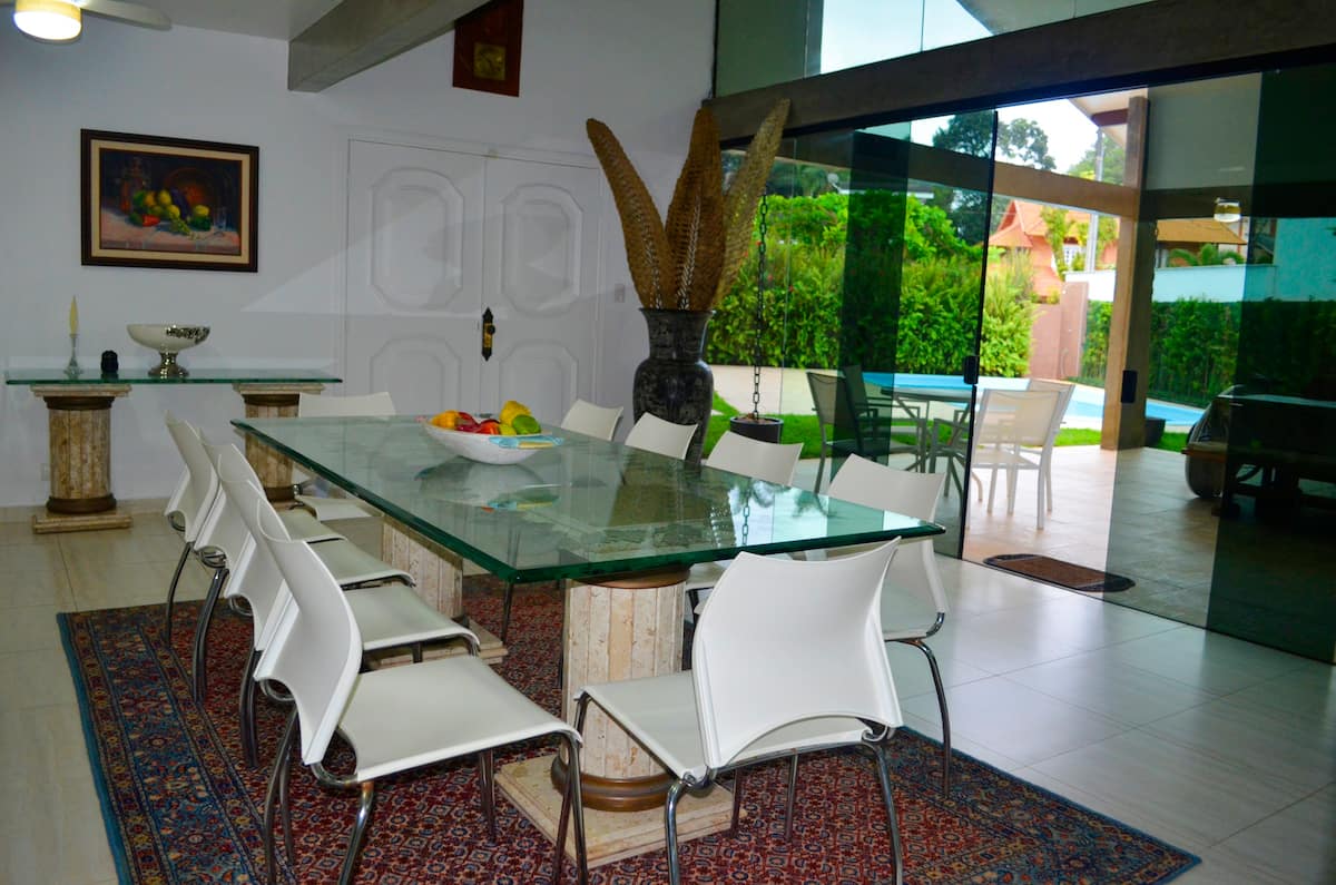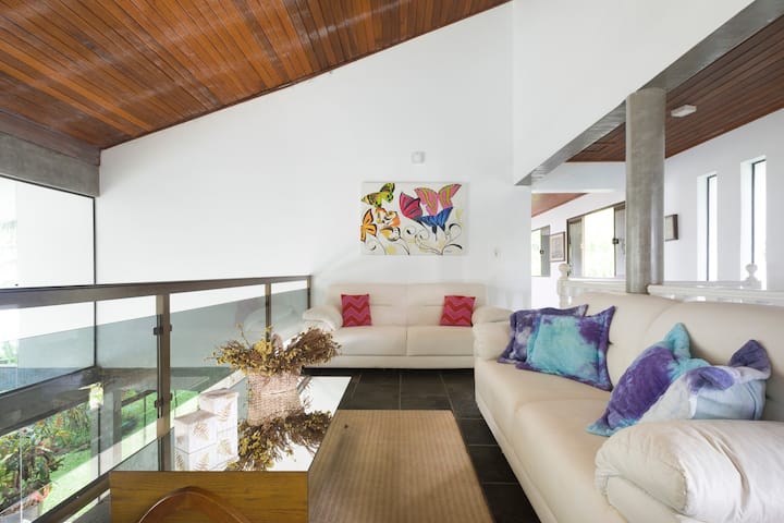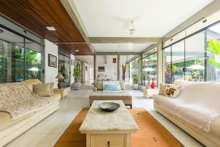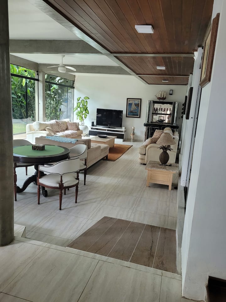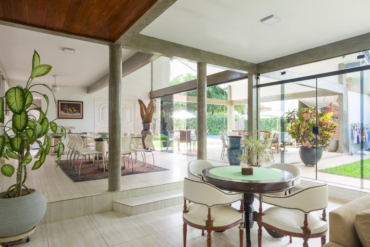 Sala com 3 ambientes e paredes de vidro que permitem contemplar o jardim, TV 55 polegadas, wi-fi, mesa de jogos , 3 sofás, bar, sala de jantar com 10 cadeiras